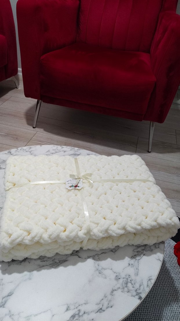 Yumuşak örgü kumaştan, desensiz beyaz çocuk battaniyesi. Hafif ve konforlu. puffy battaniye 90×90 ölçülerinde