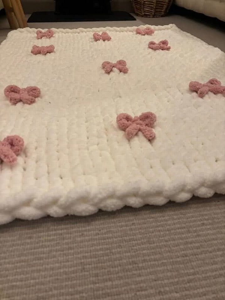 Yumuşak örgü malzemeden yapılmış, beyaz renkli ve pastel pembe nakışlı fiyonk detaylı çocuk battaniyesi. Rahat ve dekoratif.