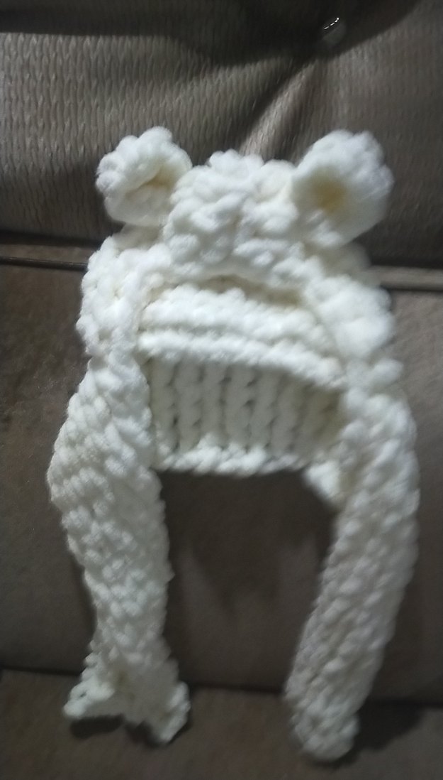 Yumuşak dokulu, kulak detaylı beyaz örgü çocuk bere. Sade tasarımıyla serin havalar için uygun.
