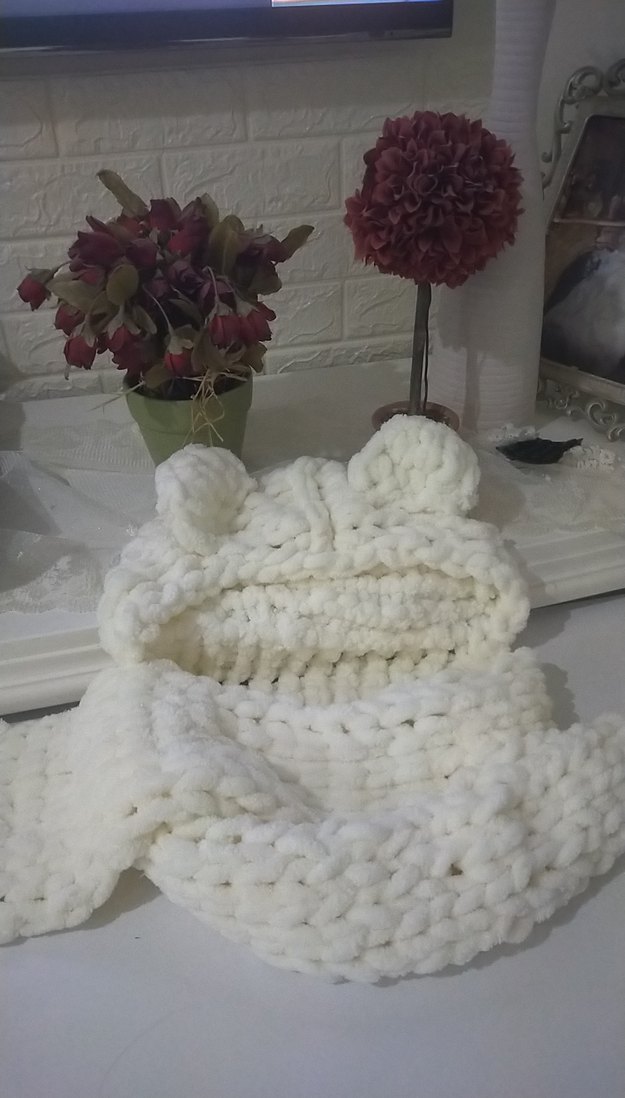 Yumuşak, kalın dokulu beyaz örgü çocuk bere ve atkı seti. Düz, pastel renklerde, bohem tarzda ve rahat hissiyatlıdır. puffy iple oruldu
