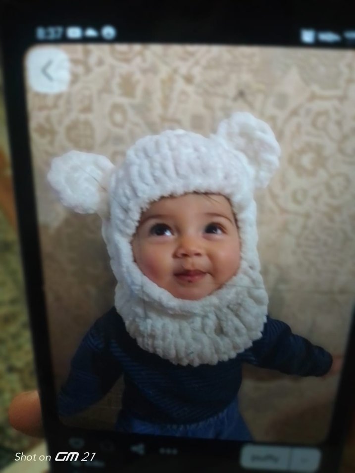 Beyaz örgü çocuk bere ve boyunluk, etnik desenli ve yumuşak dokuludur. Düz ve sade tarza sahiptir, kulak detayları bulunur.