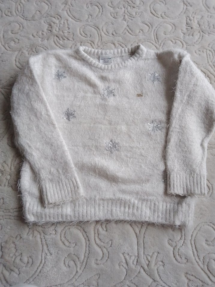 Uzun kollu, yuvarlak yaka beyaz örgü kazak. Salaş kesim, normal boy ve rahat bir kullanım sunar. Üzerinde hafif kar tanesi desenleri bulunur. ☃️