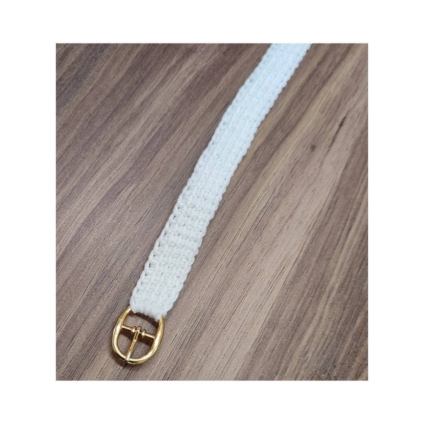 Altın rengi çelik tokalı, beyaz merserize ip örgüden yapılmış kemer. Minimalist ve kültür tarzında kız çocuk kemeri. ✨ Toka 1,5 cm. Toplam uzunluk 64 cm. İstenilen ölçüye göre ayarlanabilir. Kolay yıkanır, kir tutmaz. Minik tokası elbise üzerine şıklık katar. (erkek çocuk pantolonu için de uygundur. El yapımı. Sağlam, muntazam, sağlıklı ,şık.