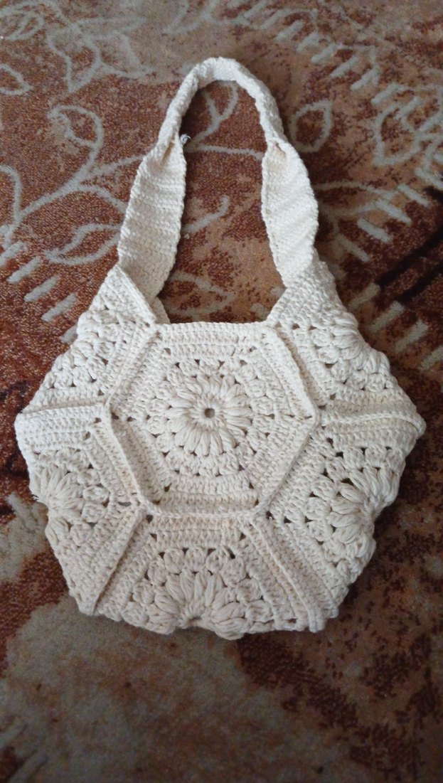 Beyaz renkli, örgü kumaştan yapılmış, dantel detaylı, altıgen desenli bohem kadın çantasıdır.