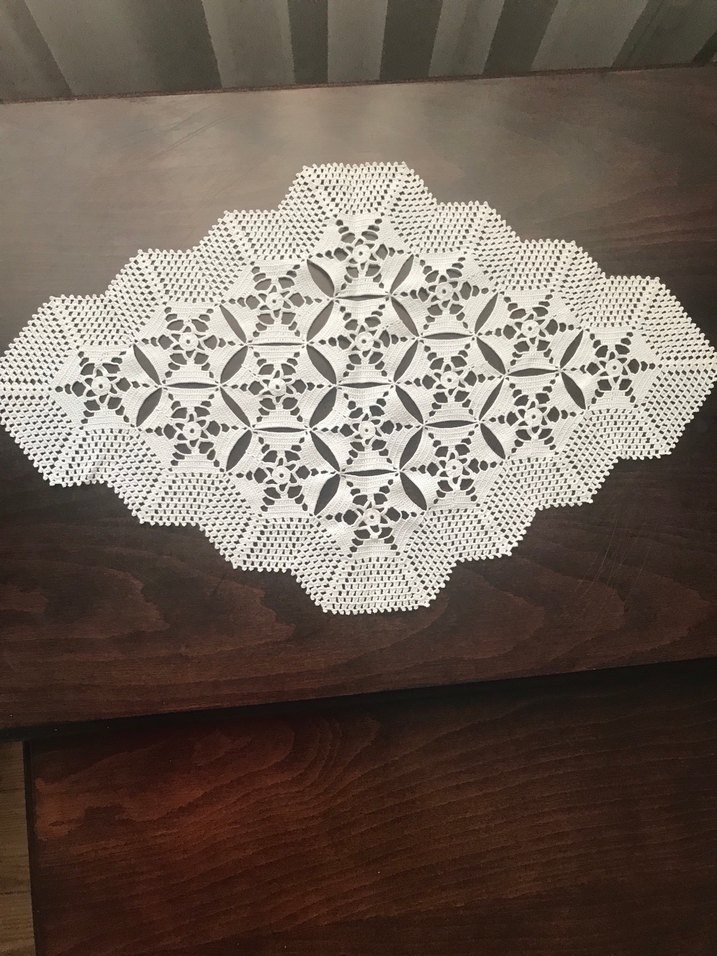 Geleneksel çiçek desenli beyaz örgü dantel örtüsü, detaylı dalgalı kenarlarla süslenmiştir.