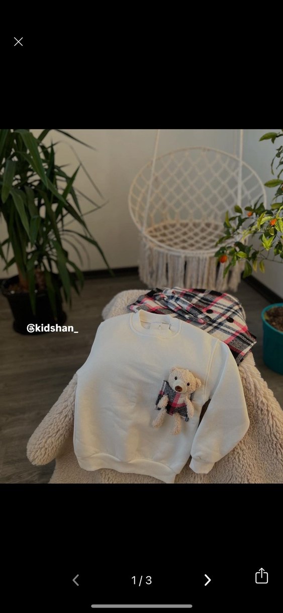 Bu beyaz örgü köpek kazağı, önünde küçük bir ayıcık detayı ve pastel renklerde baskılı desenle sokak stilini yansıtıyor. @kidshan_ etiketi bulunur.