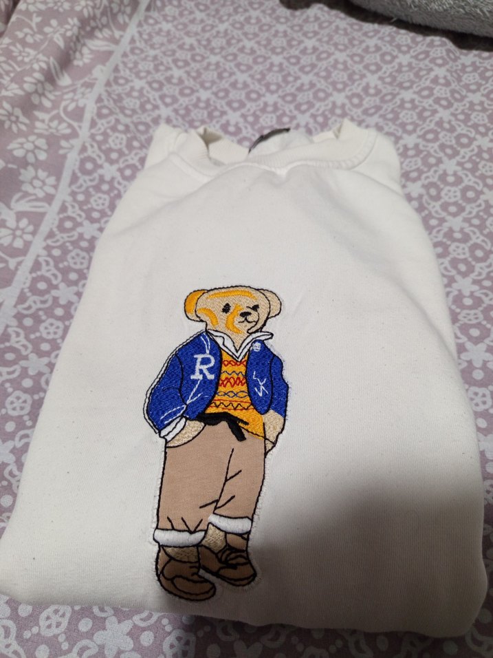 Beyaz örgü köpek kazak, pastel sokak stili ve baskılı ayı deseniyle dikkat çekiyor. Evcil hayvanlar için yumuşak ve rahat.