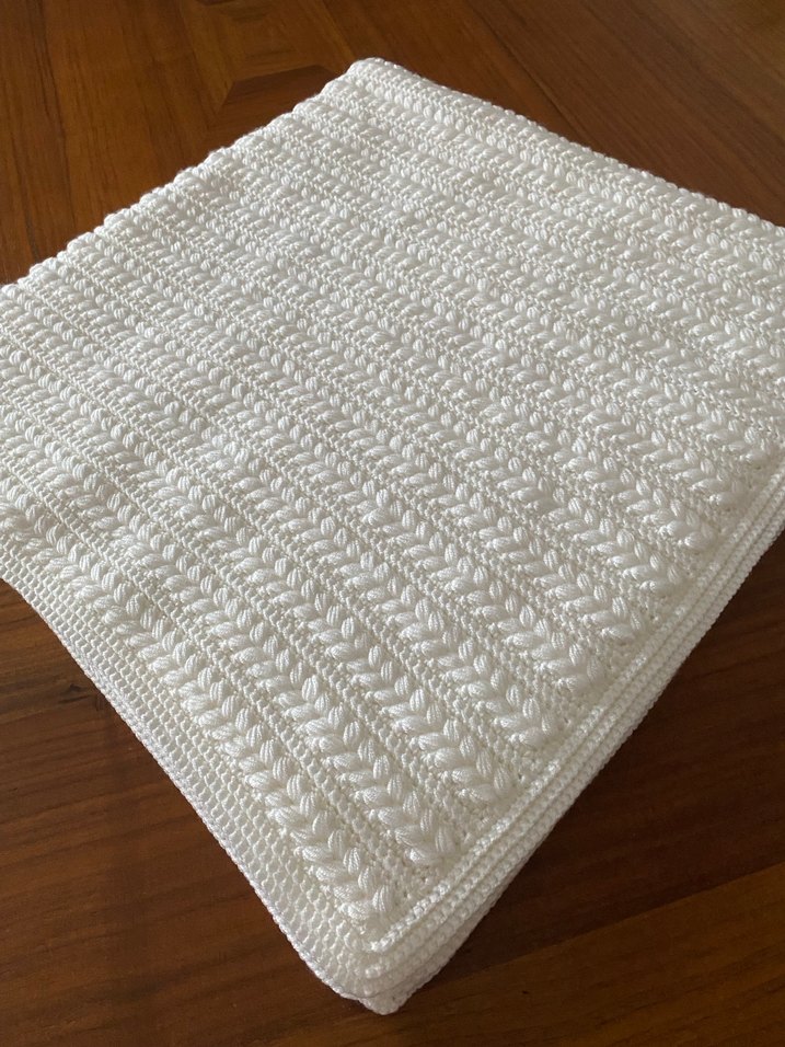 Beyaz renkli, yumuşak dokulu, desensiz örgü bebek battaniyesi, çocukların rahatlığı için uygundur.