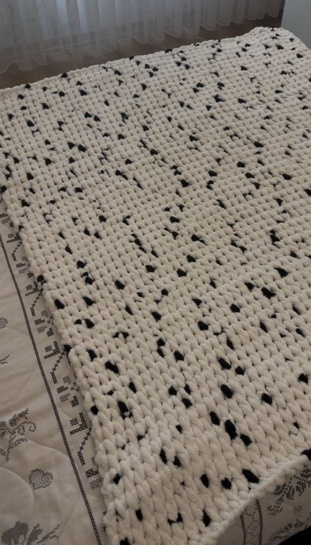 Beyaz renkli, gri detaylı örgü çocuk battaniyesi, yumuşak ve rahat dokusuyla konfor sağlar.