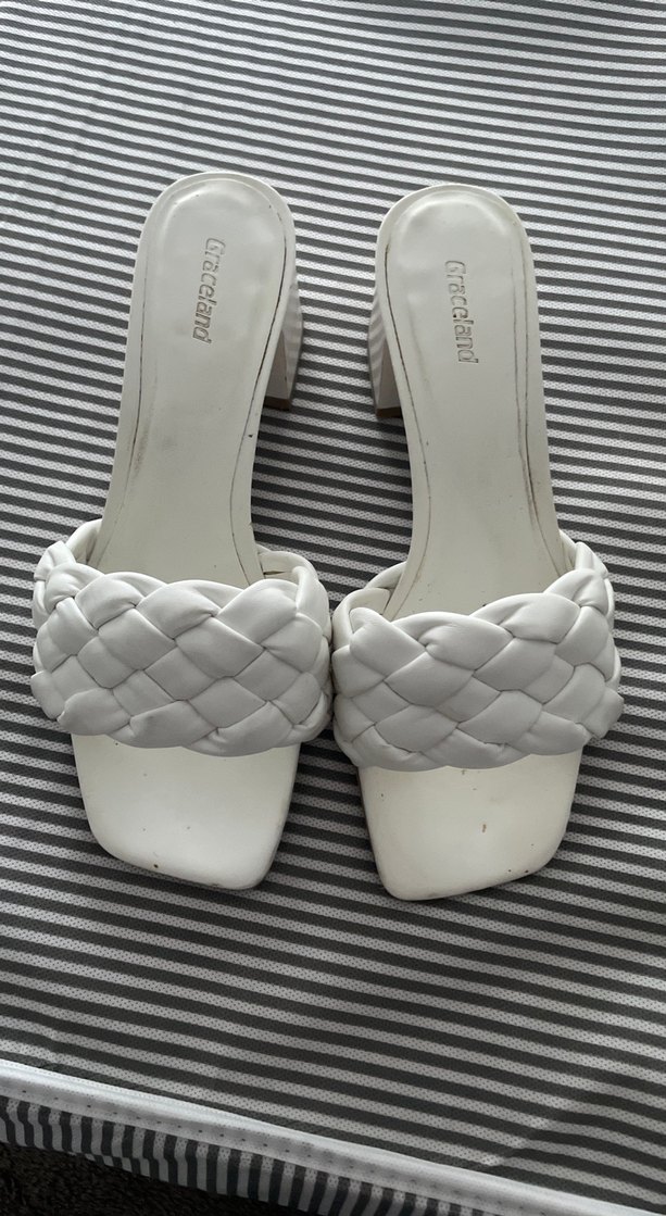 Beyaz örgü detaylı bant ve kauçuk blok topuğa sahip kadın terlikleri. Kare burunlu ve Graceland markalıdır. Günlük kullanıma uygun şık bir model.