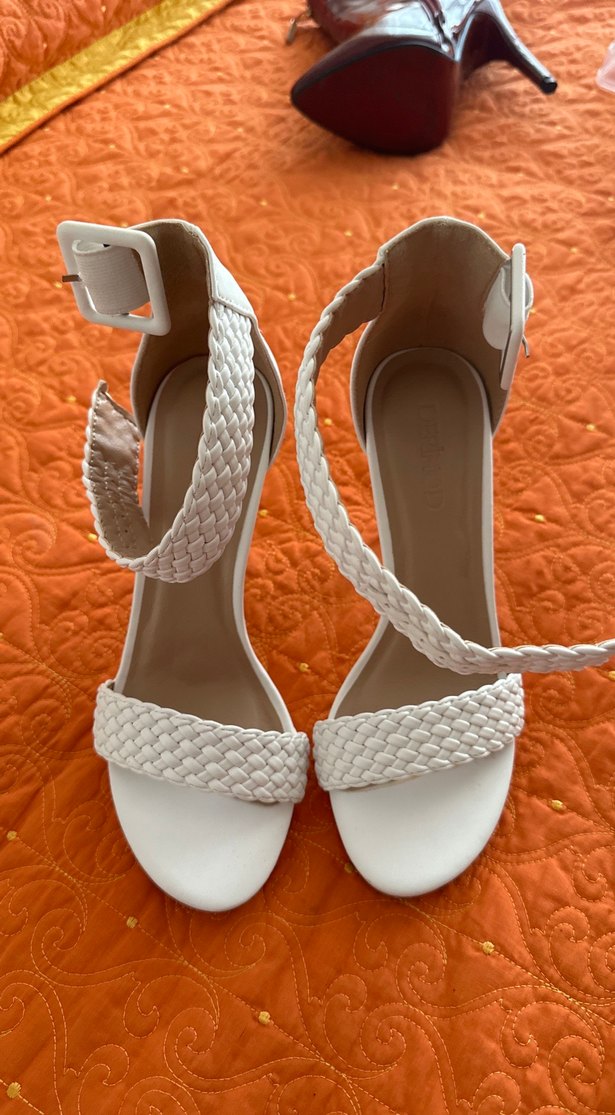 Beyaz blok topuklu kadın sandaletler, örgü detaylı ve bağcıklı tasarıma sahip, sentetik kumaştan yapılmış hafif yılan derisi desenli, düğün için uygun.
