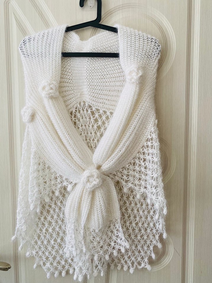 Ağır bir üründür. Bu beyaz örgü kadın şal, çiçek detayları ve açık örgü deseniyle rahat ve bohem bir görünüm sunar. Serin havalar için ideal.