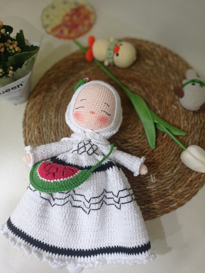 Bu bebek, gri ve siyah desenli beyaz örgü elbise ve kapüşon ile tasarlanmıştır. Yüzü sade ve huzurlu görünümdedir. Amigurumi