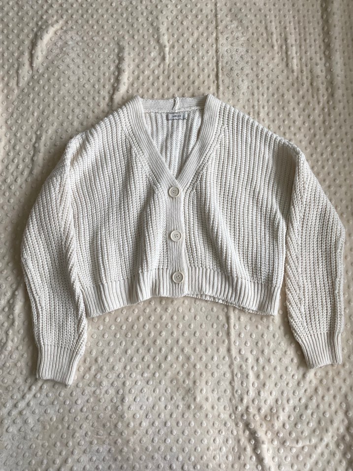 Beyaz örgü hırka, uzun kollu ve bol kesimdir. Rahat ve sade tarzıyla günlük kullanıma uygundur. Hiç bir kusuru yok.