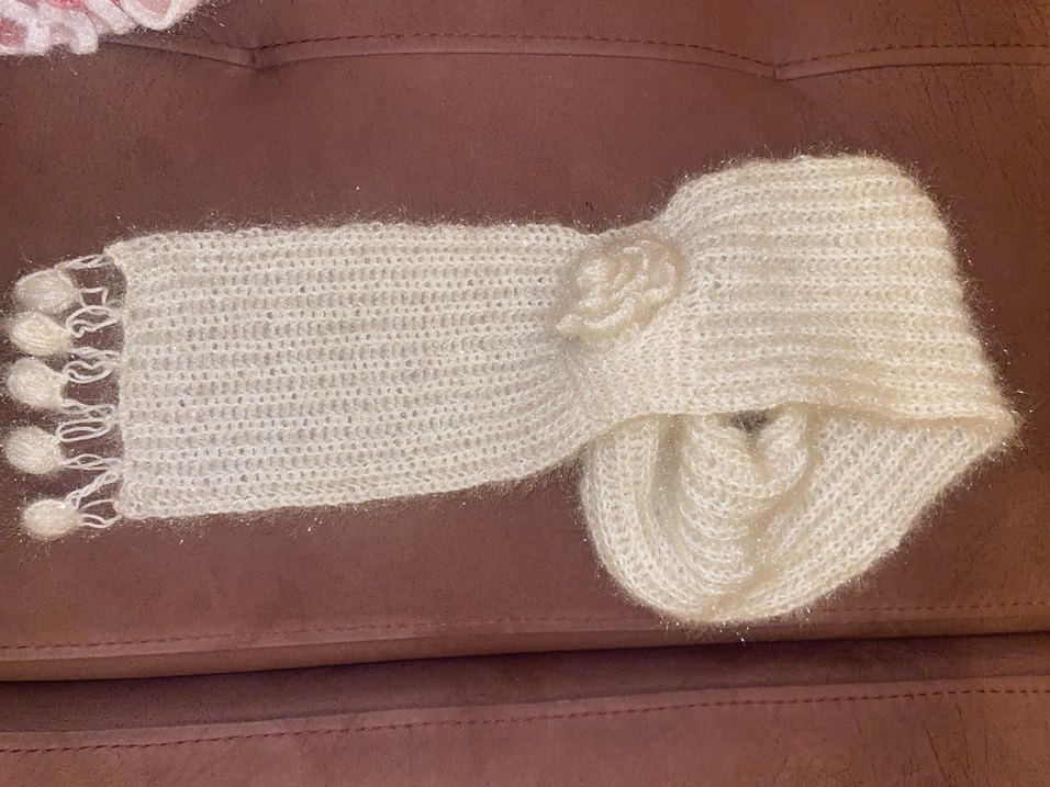 Yumuşak örgü kumaştan yapılmış, açık beyaz renkte kadın atkısı. Rahat örgü dokusuna ve sade tasarıma sahiptir. İpi saçaklı gibi parlak atkıdan daha çok aksesuar gibi