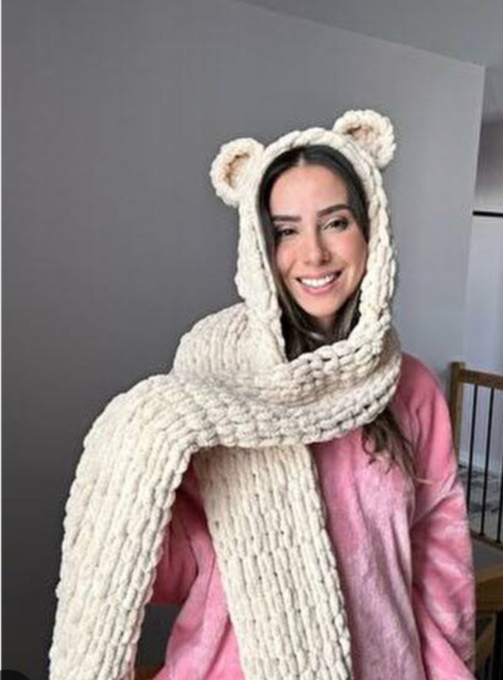 Beyaz örgü kadın atkı, kapüşonunda sevimli ayı kulaklarıyla sıcak ve eğlenceli bir görünüm sunar. Yumuşak dokusuyla bohem ve retro tarza uygundur.
