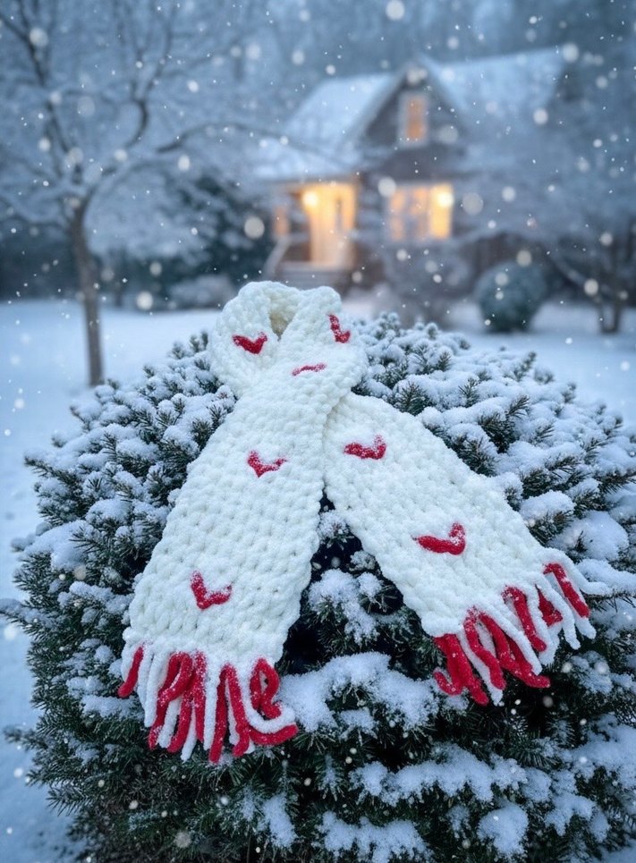 Kırmızı kalp desenli, püsküllü beyaz örgü kadın atkısı. Kalın örgü yapısıyla sıcak tutar, sade ve rahat sokak stili için uygundur. ❄️