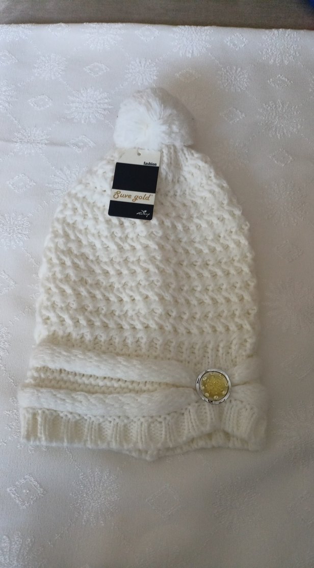 Üstünde ponpon ve süs düğmesi bulunan parlak beyaz örgü kadın bere, sokak modasına uygun rahat bir görünüme sahiptir. ❄️