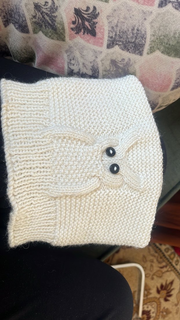 Beyaz örgü kadın bere, önünde sevimli baykuş deseniyle bohem bir hava katıyor. Rahat ve sıcak dokusu ile öne çıkar.