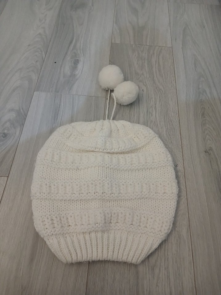 Beyaz örgü kadın bere, bohem tarzda ve iki ponpon detaylı, soğuk havalar için ideal bir aksesuar. ❄️