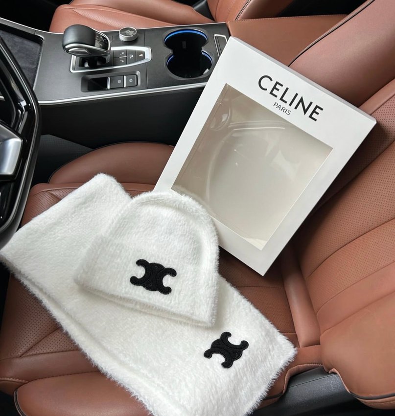 CELINE markalı beyaz örgü kadın bere, yumuşak ve sıcak kumaştan, sade ve modern tasarıma sahip. Koyu renk logo detayı bulunur.