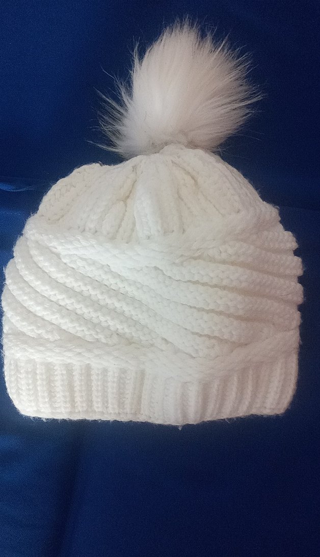 Yumuşak örgü kumaştan yapılmış, üstünde tüylü ponpon bulunan beyaz kadın bere, rahat ve sokak stiline uygun.