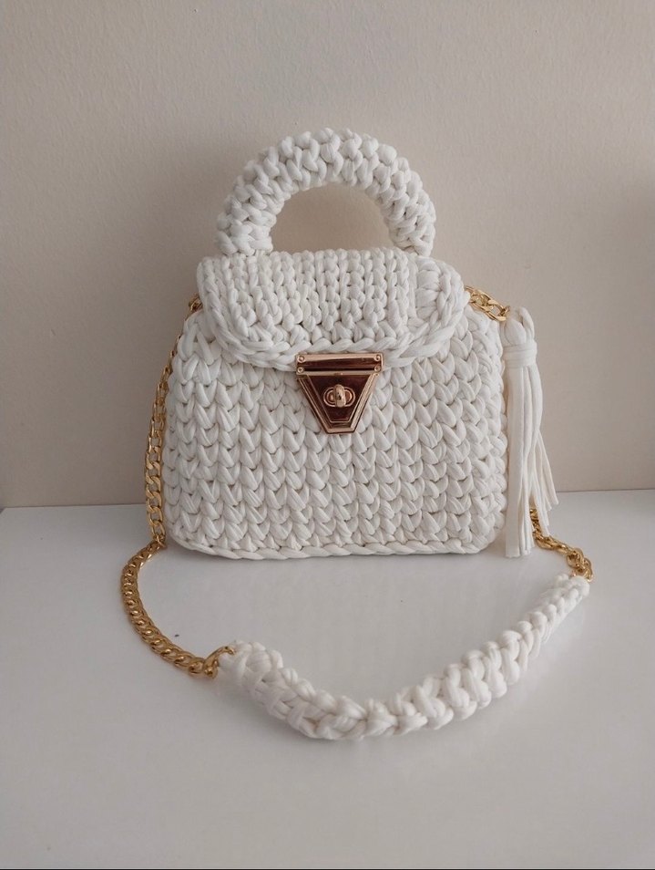 Beyaz örgü dokusuyla, altın zincir askılı ve elde tutma saplı, rahat bohem tarzda günlük kullanıma uygun kadın çanta.