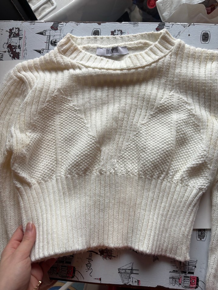 Beyaz fitilli örgü kadın kazağı, yuvarlak yaka ve uzun kolludur. Orta uzunluktadır. Giyilmedi hafif iç gösteren kısımlar belli.Teklife açık ❄️