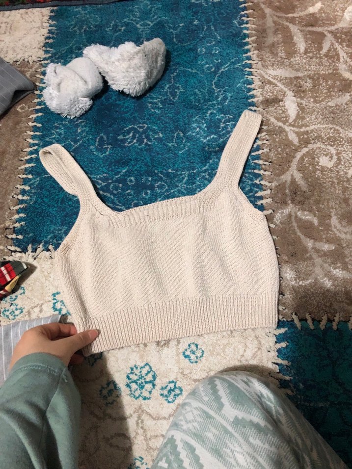 Beyaz, örgü, askılı ve salaş kesim kadın crop top. Rahat ve bohem tarzıyla günlük kullanıma uygundur.