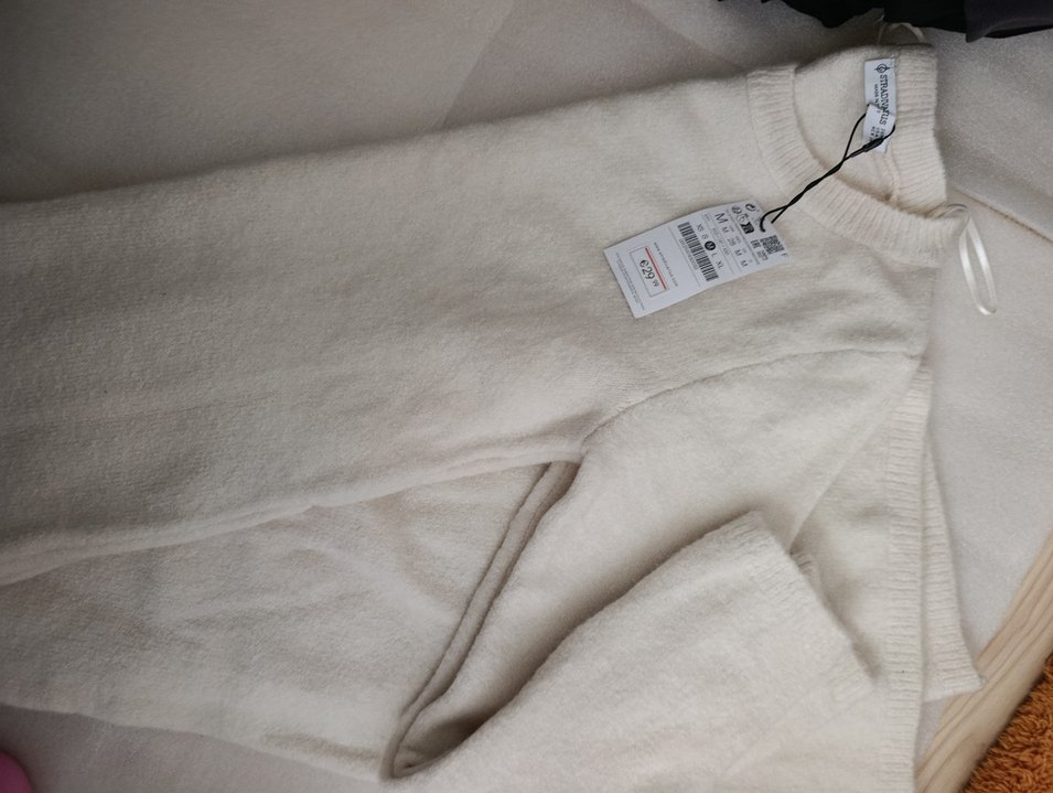 Beyaz, örgü, pamuklu kumaştan yapılmış, yuvarlak yakalı ve uzun kollu, bol kesim kadın sweatshirt. Rahat ve sade tarzda, günlük kullanım için uygundur.