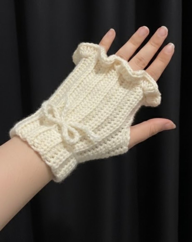 Beyaz örgü kadın eldiveni, fırfırlı kenar ve fiyonk detaylı, rahat ve vintage esintili pinterest eldiveni İstenilen renkte örülür.