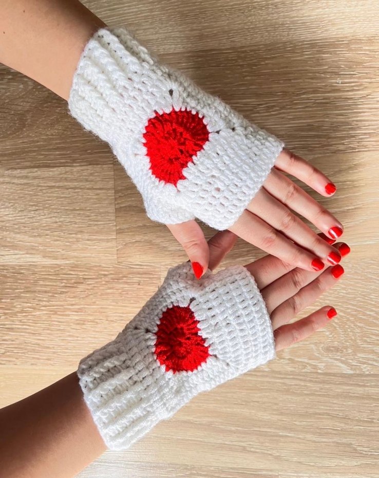 Kırmızı kalp desenli beyaz örgü kadın eldiveni. Parmaksız ve yumuşak, sıcak tutan dokusu ile bohem ve retro tarzda rahat bir seçim. ❤️