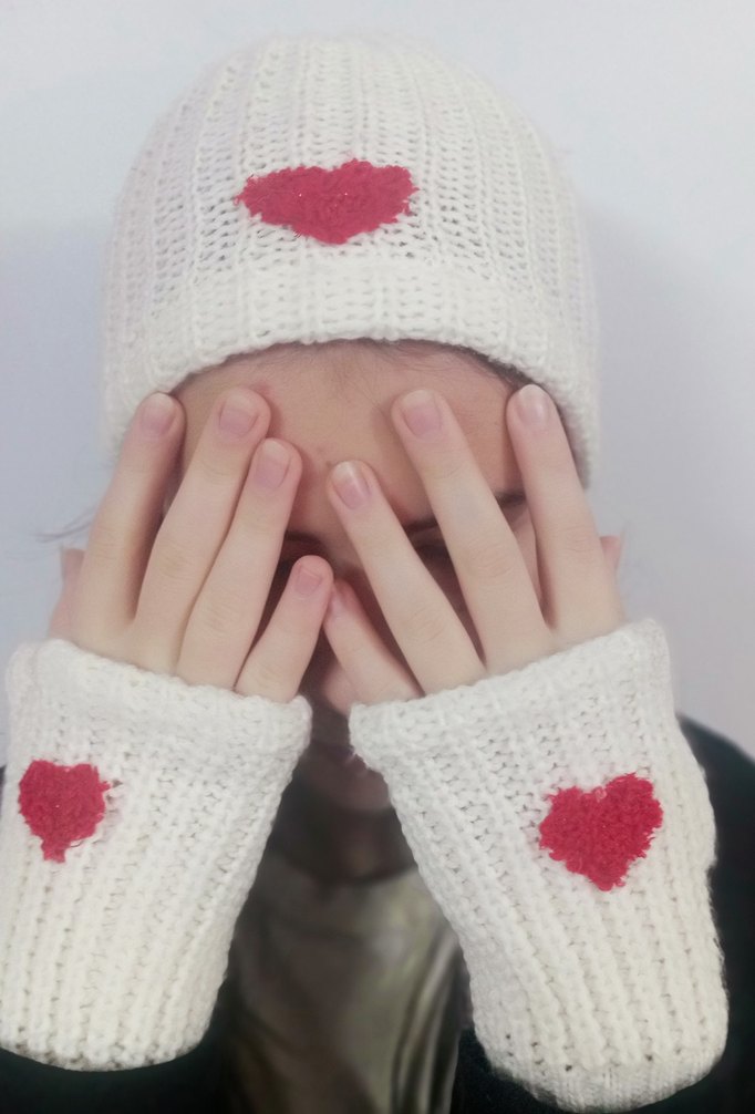 Kırmızı kalp detaylı, beyaz örgü kadın eldiveni ve şapka rahat ve bohem tarzda tasarlanmıştır.