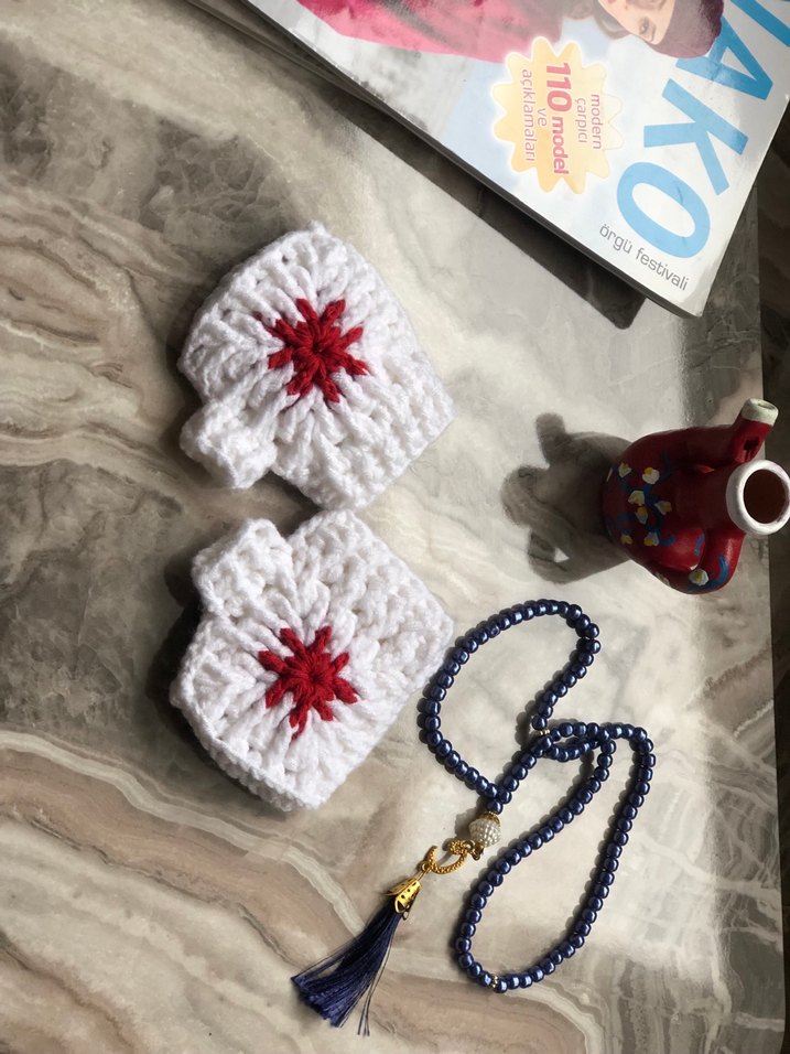 Beyaz örgü kadın eldivenleri, renkli kırmızı yıldız deseniyle örülmüş, rahat ve sade bir stile sahip.