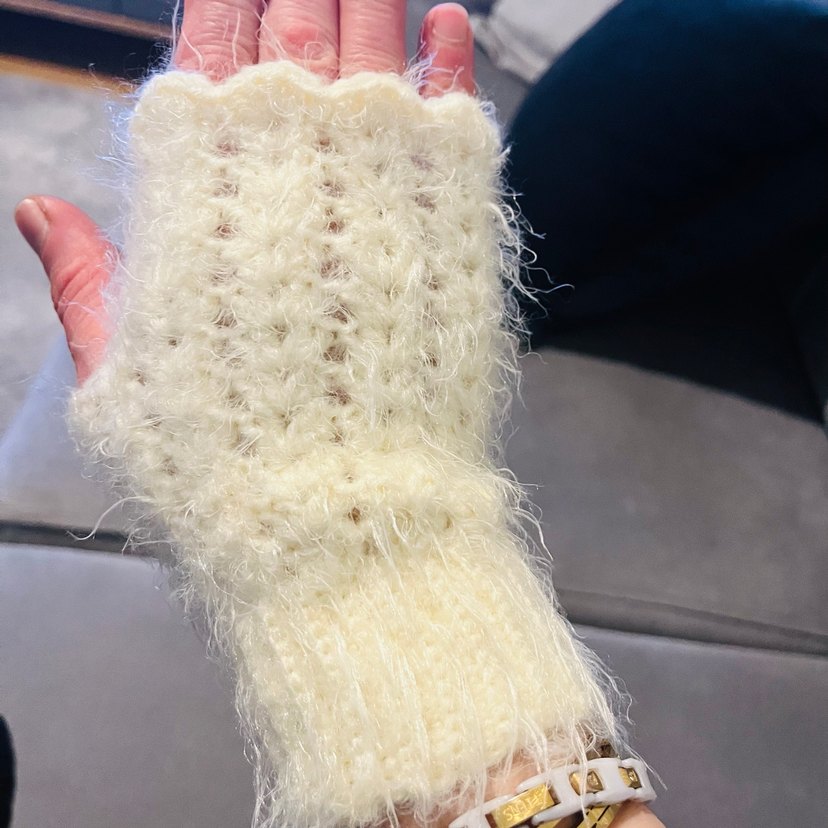 Beyaz örgü kadın eldivenleri, yumuşak ve rahat dokusu ile bohem tarzda. Pastel tonlarda ve vintage havasında.
