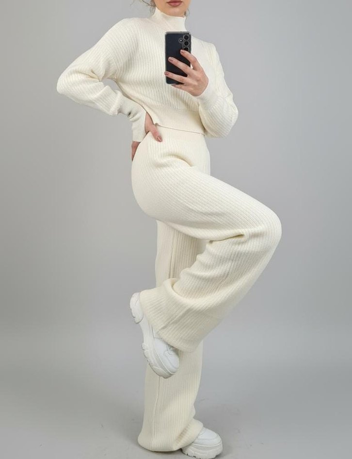 Beyaz örgü kadın eşofman takımı, yüksek yakalı ve uzun kolludur. Yumuşak ve sıcak kumaştan, normal kesim ve midi boydadır.