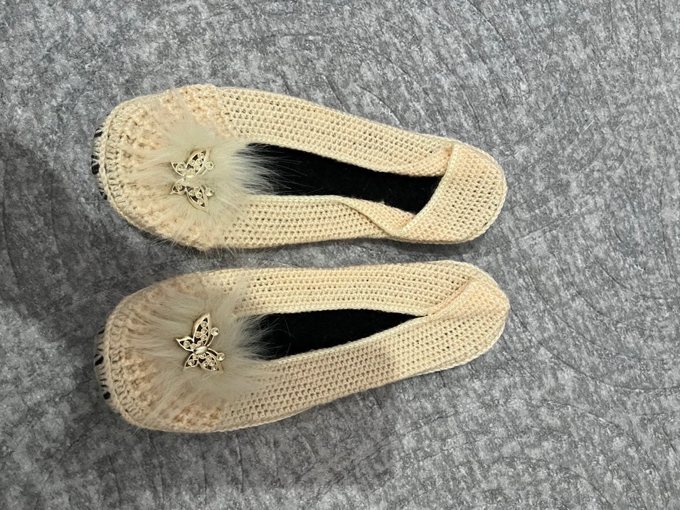 Beyaz örgü kadın ev terliği, kürk detaylı ve nakışlı kelebek süslemelidir. Konforlu kama topuklu, günlük kullanım için uygundur. El yapımı sıfırdır yenidir
