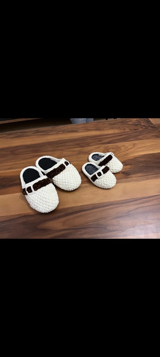 Beyaz örgü kadın ev terlikleri, koyu renkli bant detayıyla sade bir tasarım sunar, günlük kullanım için rahat ve şık. anne kız kombin