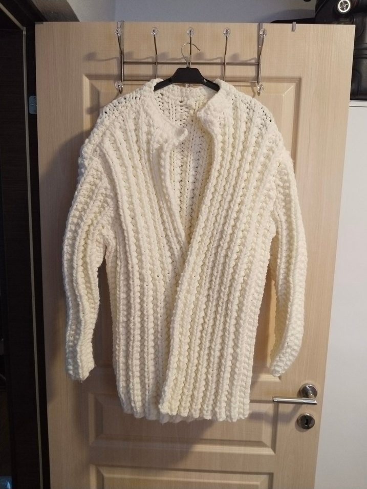 Beyaz el örgü kadın hırka, uzun kollu ve salaş kesimlidir. Bohem tarzıyla günlük kullanıma uygundur.