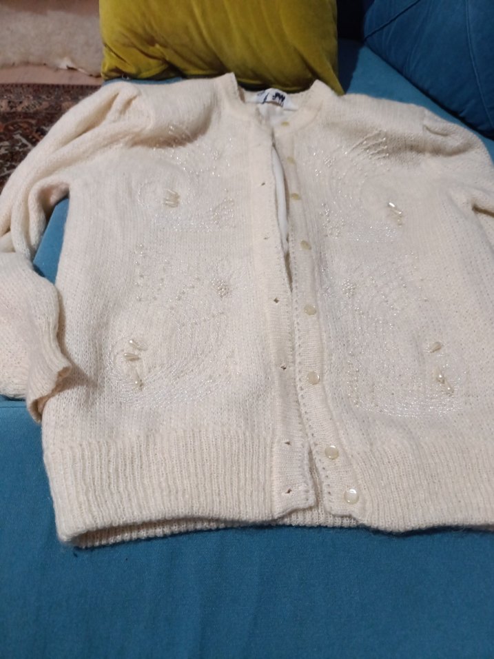 Uzun kollu, yuvarlak yaka, örgü beyaz kadın hırka. Rahat kesimli, midi boyda, desen içermeyen, İnci işlemeli astarlı vatkalı günlük kullanıma uygun.