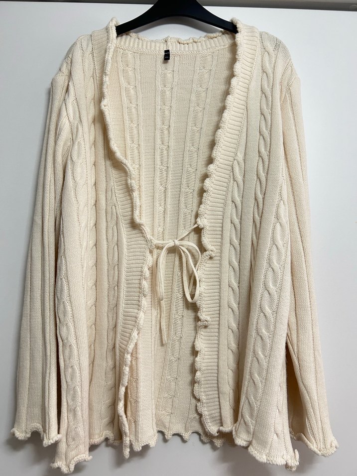 Beyaz örgü kadın hırka, uzun kollu ve bol kesimdir. Notlu yaka ve midi boyda, bağcıklı ve hafif fırfırlı detaylara sahiptir. Rahat ve bohem tarzda, günlük kullanım için uygundur.
