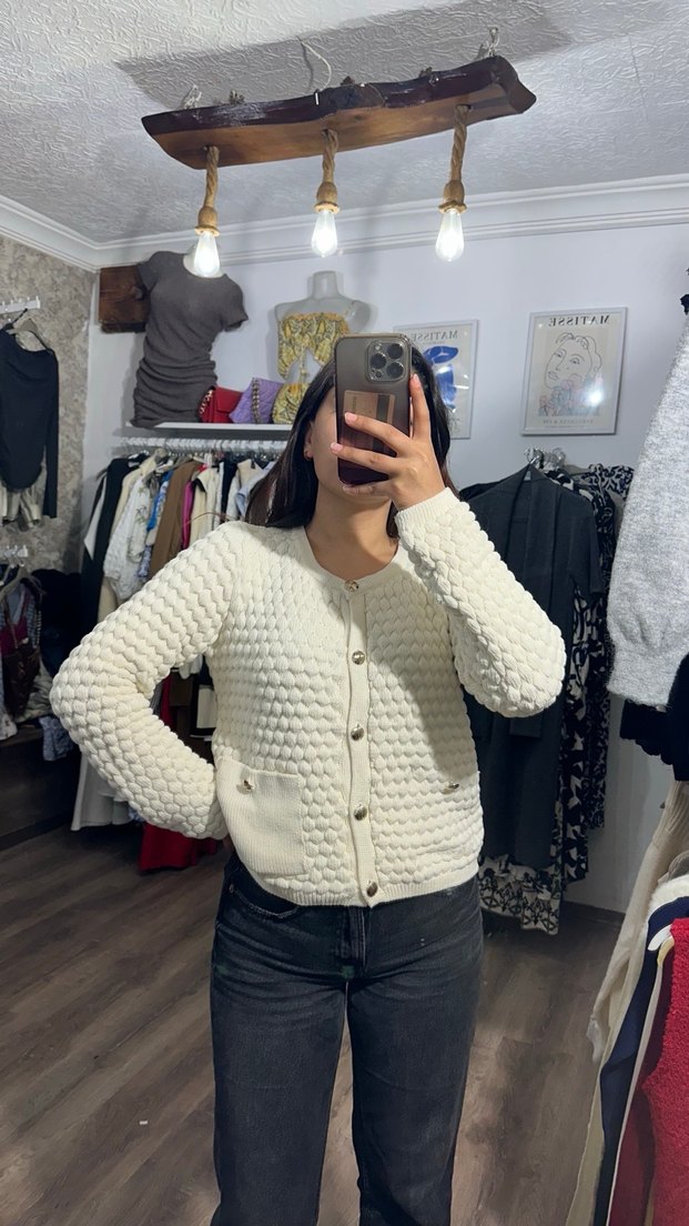 Bu beyaz örgü kadın hırka, uzun kollu ve yuvarlak yaka tasarımıyla rahat ve şık bir günlük giyim seçeneği sunar.