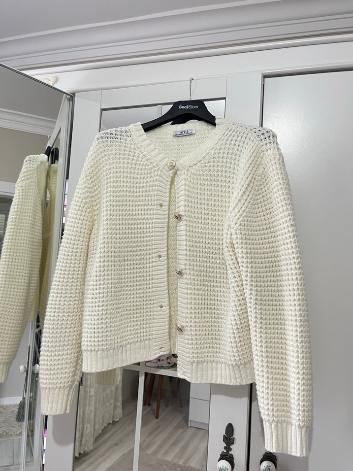 Beyaz renkli, örgü dokulu, yuvarlak yaka ve uzun kollu, bol kesim kadın hırka, rahat ve günlük kullanım için uygundur. s m l giyene olur standart beden