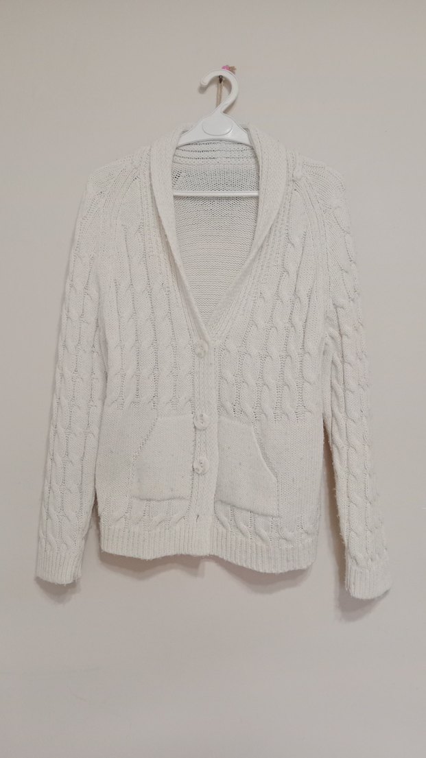 Beyaz örgü kadın hırka, notlu yakalı ve uzun kolludur. Rahat kesim ve normal midi boydadır. Ön cepleriyle konforlu bir dokusu vardır.