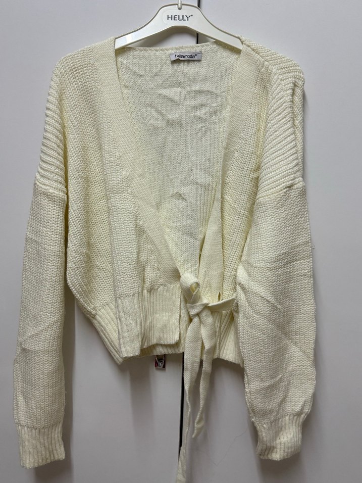 Beyaz örgü kadın hırka, uzun kollu ve bol kesimdir. Kısa boyu ve yuvarlak yakası vardır. Önünde bağlama detayı bulunan sade ve rahat tasarım.