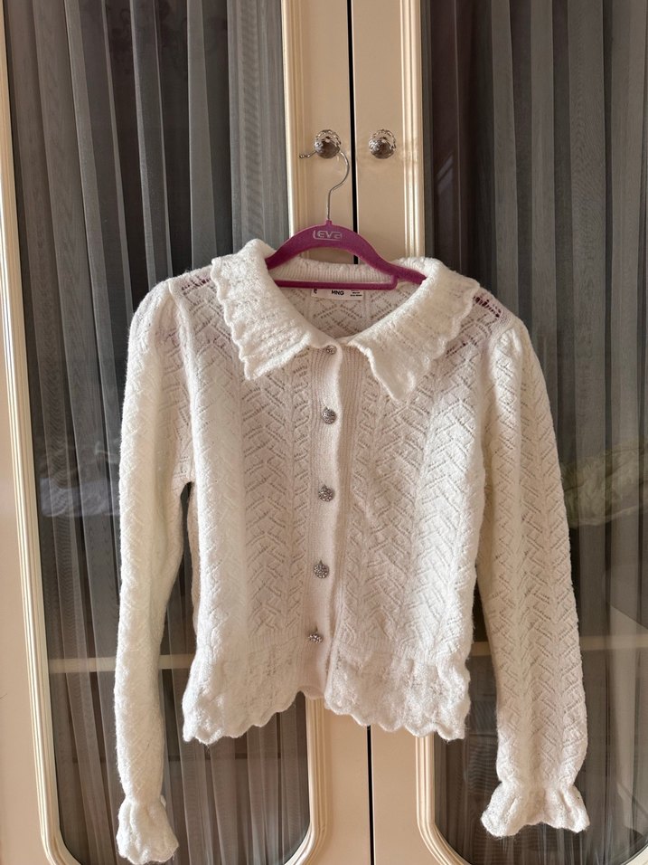 Uzun kollu, yakalı ve rahat kesim beyaz örgü kadın hırka. Düğmeli ve rahat dokusu ile gündelik kullanıma uygundur.