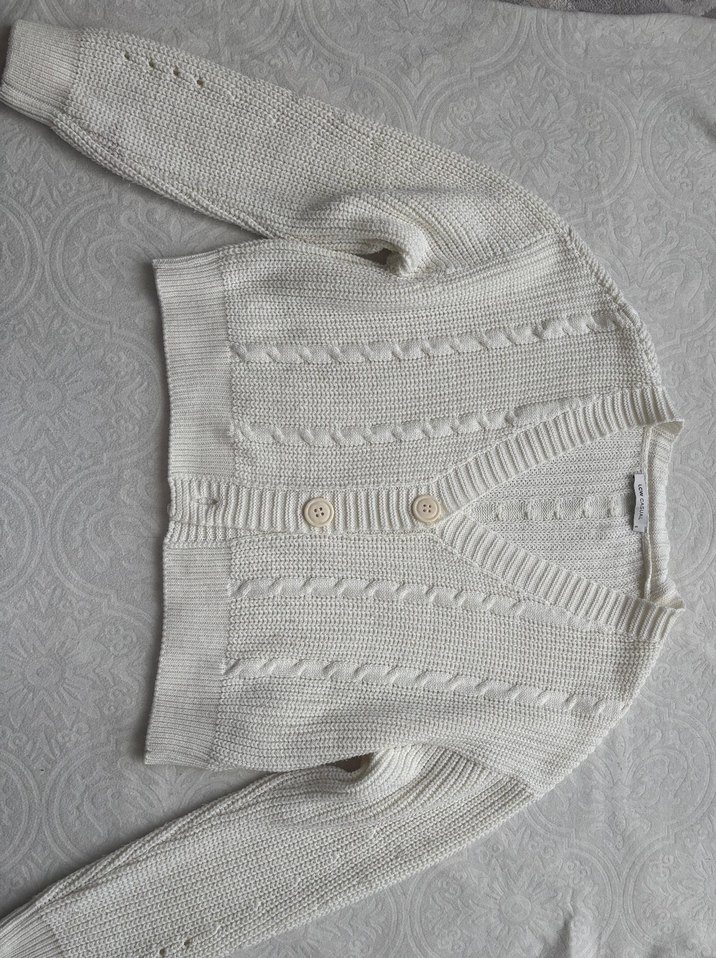 Beyaz örgü kumaştan, uzun kollu ve bisiklet yaka, düğmeli, normal midi boy, vücuda oturan kadın hırka. Günlük rahat kullanıma uygun. tek düğmesi eksiktir.