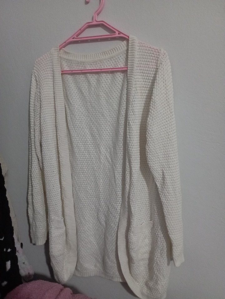 Beyaz örgü kadın hırka, uzun kollu, bol kesim ve yuvarlak yaka detaylarına sahiptir. Normal midi boyda, desen içermeyen rahat bir tasarımdır.