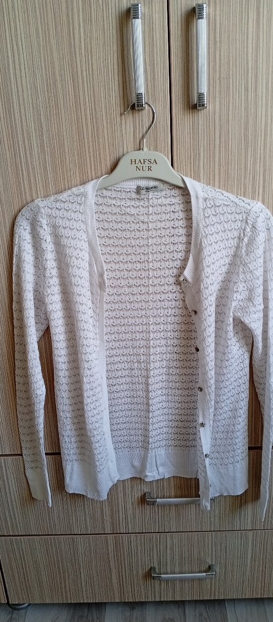 Beyaz örgü kadın hırka, uzun kollu ve yuvarlak yakalıdır. midi boyuyla günlük kullanıma uygundur.. M beden