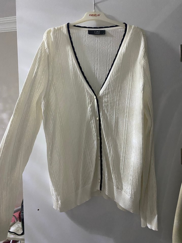 Beyaz örgü kadın hırka, uzun kollu ve V yakalıdır. Yumuşak pamuktan, bol kesim ve midi boydadır. Günlük sokak stiline uygundur.